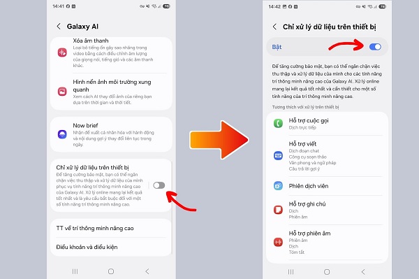 Để sử dụng tính năng này, người dùng chỉ cần truy cập vào mục Cài đặt, chọn Galaxy AI, kéo xuống dưới và kích hoạt lựa chọn “Chỉ xử lý dữ liệu trên thiết bị”. Đây là giải pháp hoàn hảo dành cho những ai thường xuyên sử dụng các dịch vụ AI và muốn bảo mật tuyệt đối thông tin cá nhân.