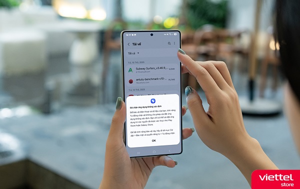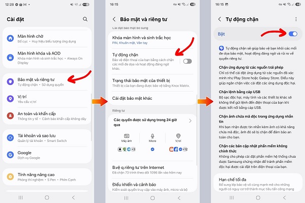 Khi kích hoạt Auto Blocker, Galaxy S25 Ultra tự động cảnh báo và ngăn chặn ngay các ứng dụng độc hại này, giúp người dùng yên tâm hơn rất nhiều khi sử dụng thiết bị của mình. Bạn có thể dễ dàng kích hoạt tính năng này bằng cách vào Cài đặt, chọn Bảo mật và Riêng tư và bật chế độ Tự động chặn (Auto Blocker) để duy trì trạng thái an toàn tuyệt đối cho thiết bị.