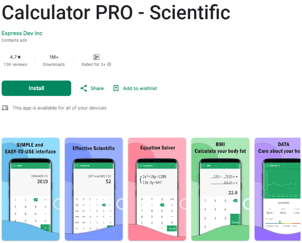Calculator Pro là một ứng dụng máy tính bỏ túi với đầy đủ chức năng được tích hợp sử dụng ngay trên chiếc điện thoại. Bạn có thể thực hiện các phép toán từ đơn giản đến phức tạp một cách nhanh chóng và dễ dàng với công cụ này.