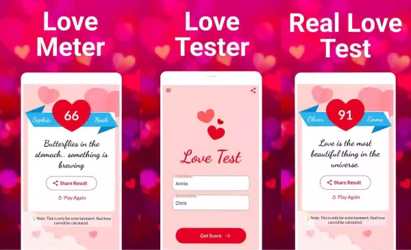 App Love Tester giúp người dùng đánh giá mức độ hiểu nhau của các cặp đôi một cách đơn giản và nhanh chóng. Bạn chỉ cần tải và cài đặt ứng dụng về điện thoại, sau đó nhập tên của bạn và đối phương, sau đó bạn nhấn nút “Get Score” để nhận được điểm đánh giá tương ứng. Kết quả kiểm tra này có thể dễ dàng chia sẻ trên các mạng xã hội và thử lại với người khác bằng cách nhấn vào “Play Again”.