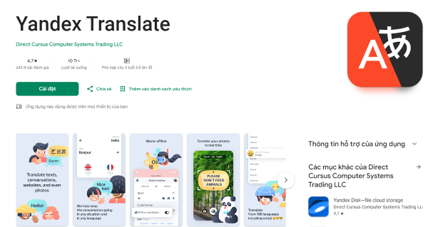 Ưu điểm của ứng dụng Yandex Translate: