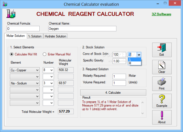 Chemical Reagent Calculator là một công cụ hỗ trợ đắc lực cho công tác kỹ thuật phòng thí nghiệm học tập và các nhà khoa học trong việc nghiên cứu, tính toán các giải pháp thực hành thí nghiệm hóa học thực tế. Chương trình này cung cấp các hướng dẫn trong việc tính toán những bài tập hóa học nhỏ phục vụ những việc làm thực tế có liên quan đến nhiều lĩnh vực trong cuộc sống.