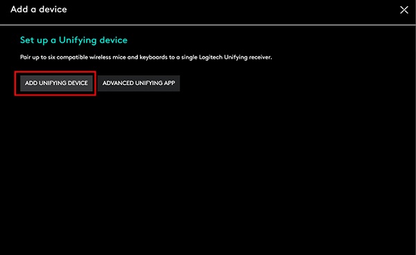 Bước 4: Chọn ADD UNIFYING DEVICE để ứng dụng dò tìm và kết nối chuột với USB Receive.