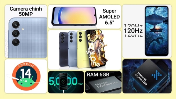 Bên cạnh đó thì con chip Exynos 1280 cùng 6GB RAM sẽ đảm bảo đáp ứng tốt các tác vụ hàng ngày, chơi game nhẹ nhàng. Với viên pin 5000mAh Samsung Galaxy A25 5G 6GB 128GB cho thời gian sử dụng lâu dài, hỗ trợ sạc nhanh 25W.