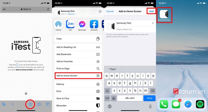 Khi truy cập vào website itest để trải nghiệm Android trên iPhone tại giao diện web bạn cần thêm shortcut của trang web lên màn hình của iPhone. Các bước thực hiện như hình ảnh bên dưới.