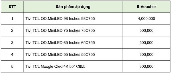 - Hình thức: Người tiêu dùng mua sản phẩm TV TCL theo danh sách áp dụng, nhận quà tặng và E-voucher tương ứng với sản phẩm theo quy định.