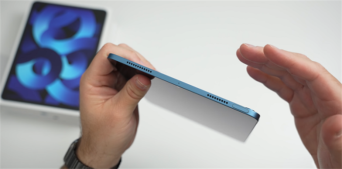 Cạnh trên của iPad Air 5 2022 vẫn là nút nguồn kiêm Touch ID, hơi đáng tiếc là máy không có Face ID. Ngoài ra, máy còn được trang bị 4 dải loa nằm ở 2 cạnh trên và dưới.