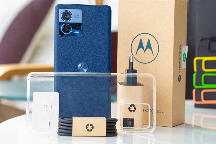 Trên tay Motorola Edge 30 Fusion cho thấy sản phẩm sở hữu ngôn ngữ thiết kế quen thuộc của các dòng điện thoại Motorola ra mắt trong thời gian vừa qua. Thiết bị có bao bì được đóng hộp rất thân thiện với môi trường làm hoàn toàn bằng bìa carton, bên trong đi kèm với củ sạc nhanh, cáp sạc và ốp lưng cùng sách hướng dẫn sử dụng.