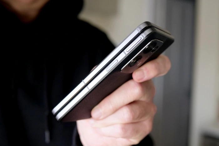 Một điểm nhấn quan trọng trên OPPO Find N2 là mặt lưng. OPPO sử dụng 2 loại chất liệu để hoàn thiện N2 gồm: da và kính nhám. Cả 2 phiên bản này đều có khả năng chống bám vân tay và mồ hôi rất tốt. Tuy nhiên, chất liệu da có phần chiếm ưu thế hơn.