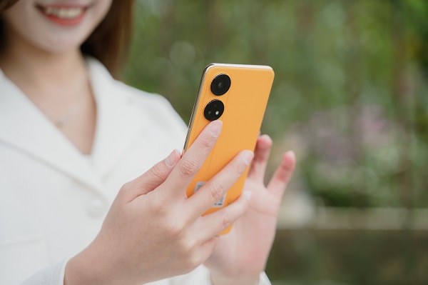 Reno8 T có 2 tùy chọn về màu sắc gồm: Đen và Cam. Phiên bản mình trên tay hôm nay là bản màu Cam. Nhờ sử dụng chất liệu giả da nên mặt lưng không xuất hiện tình trạng bám vân tay và mồ hôi. Do đó, dù không dùng ốp máy vẫn giữ nguyên được nét đẹp.