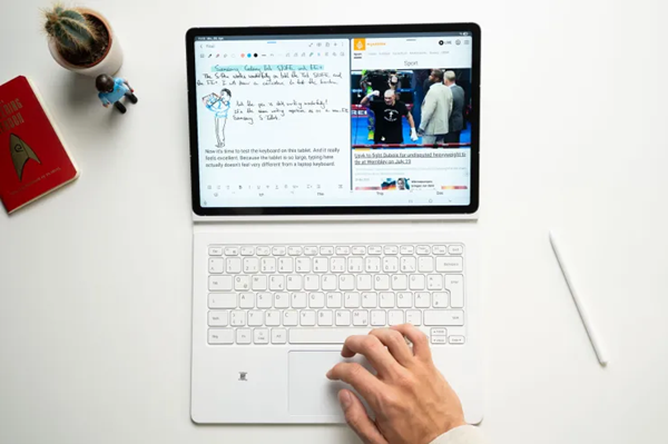 Hệ thống 4 loa AKG hỗ trợ Dolby Atmos được trang bị ở hai cạnh máy giúp mang đến âm thanh đồng đều và sống động. Bút S Pen đi kèm theo máy có thiết kế gọn nhẹ và được trang bị một nút bấm giúp người dùng kích hoạt tính năng điều khiển từ xa hay ghi chú nhanh. Đặc biệt, máy có nam châm ở phần cạnh máy và mặt lưng giúp bạn dễ dàng gắn bút vào, đảm bảo không bị rơi rớt khi di chuyển.