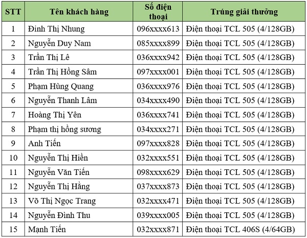 - Ngày 14/05/2024 (Quay thưởng cho các khách hàng mua hàng và được cấp mã dự thưởng từ ngày 03/05/2024 đến ngày 12/05/2024). Số lượng 05 giải điện thoại TCL 505 (4/128GB).