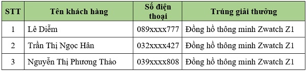 - Ngày 14/05/2024 (Quay thưởng cho các khách hàng mua hàng và được cấp mã dự thưởng từ ngày 03/05/2024 đến ngày 12/05/2024). Số lượng 01 giải đồng hồ thông minh Zwatch Z1.