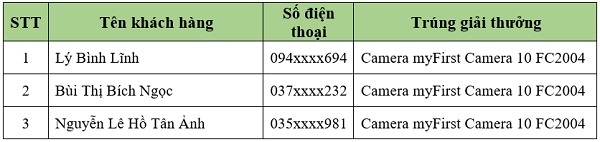 - Ngày 24/05/2024 (Quay thưởng cho các khách hàng mua hàng và được cấp mã dự thưởng từ ngày 13/05/2024 đến ngày 22/05/2024). Số lượng 01 giải Camera myFirst Camera 10 FC2004.
