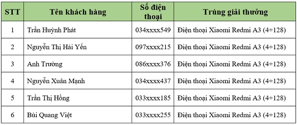 - Ngày 14/05/2024 (Quay thưởng cho các khách hàng mua hàng và được cấp mã dự thưởng từ ngày 03/05/2024 đến ngày 12/05/2024). Số lượng 02 giải điện thoại Xiaomi Redmi A3 (4+128).