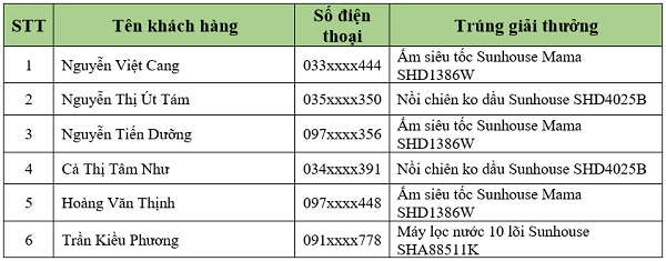 - Ngày 14/05/2024 (Quay thưởng cho các khách hàng mua hàng và được cấp mã dự thưởng từ ngày 03/05/2024 đến ngày 12/05/2024). Số lượng 02 giải, trong đó: 01 giải ấm siêu tốc inox 2 lớp 1.7L Sunhouse Mama SHD1386W; 01 giải nồi chiên không dầu 3.0L Sunhouse SHD4025B.