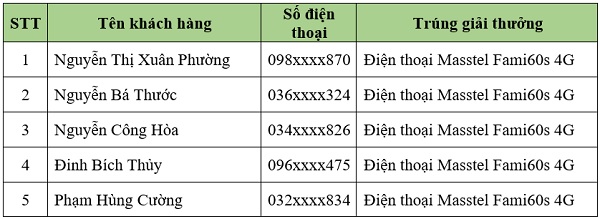 - Ngày 24/05/2024 (Quay thưởng cho các khách hàng mua hàng và được cấp mã dự thưởng từ ngày 13/05/2024 đến ngày 22/05/2024). Số lượng 01 giải điện thoại Masstel Fami60s 4G.