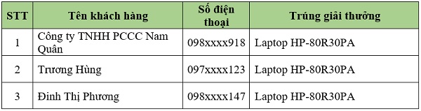 - Ngày 14/05/2024 (Quay thưởng cho các khách hàng mua hàng và được cấp mã dự thưởng từ ngày 03/05/2024 đến ngày 12/05/2024). Số lượng 01 giải laptop HP-80R30PA.