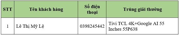 - Ngày 04/06/2024 (Quay thưởng cho các khách hàng mua hàng và được cấp mã dự thưởng từ ngày 03/05/2024 đến ngày 31/05/2024). Số lượng 01 giải tivi TCL 4K+Google AI 55 Inches 55P638.