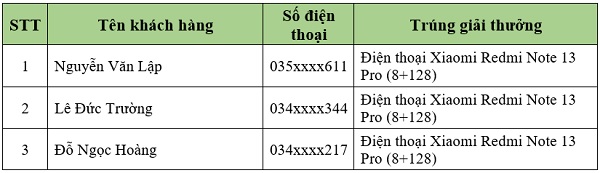 - Ngày 24/05/2024 (Quay thưởng cho các khách hàng mua hàng và được cấp mã dự thưởng từ ngày 13/05/2024 đến ngày 22/05/2024). Số lượng 01 giải điện thoại Xiaomi Redmi Note 13 Pro (8+128).