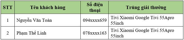 - Ngày 14/05/2024 (Quay thưởng cho các khách hàng mua hàng và được cấp mã dự thưởng từ ngày 03/05/2024 đến ngày 12/05/2024). Số lượng 01 giải tivi Xiaomi Google Tivi 55Apro 55inch.