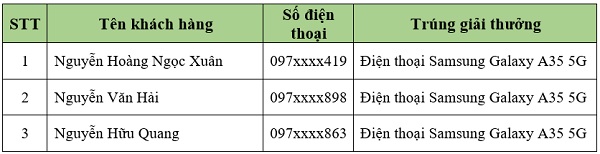 - Ngày 14/05/2024 (Quay thưởng cho các khách hàng mua hàng và được cấp mã dự thưởng từ ngày 03/05/2024 đến ngày 12/05/2024). Số lượng 01 giải điện thoại Samsung Galaxy A35 5G.