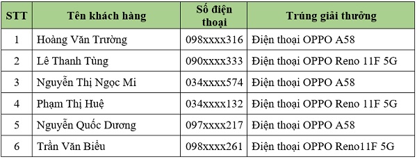 - Ngày 04/06/2024 (Quay thưởng cho các khách hàng mua hàng và được cấp mã dự thưởng từ ngày 23/05/2024 đến ngày 31/05/2024). Số lượng 02 giải, trong đó: 01 giải điện thoại OPPO Reno11F 5G; 01 giải điện thoại OPPO A58.