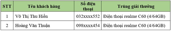 - Ngày 14/05/2024 (Quay thưởng cho các khách hàng mua hàng và được cấp mã dự thưởng từ ngày 03/05/2024 đến ngày 12/05/2024). Số lượng 01 giải điện thoại realme C60 (4/64GB).