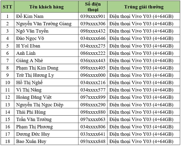 - Ngày 14/05/2024 (Quay thưởng cho các khách hàng mua hàng và được cấp mã dự thưởng từ ngày 03/05/2024 đến ngày 12/05/2024). Số lượng 06 giải điện thoại Vivo Y03 (4+64GB).
