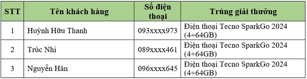 - Ngày 14/05/2024 (Quay thưởng cho các khách hàng mua hàng và được cấp mã dự thưởng từ ngày 03/05/2024 đến ngày 12/05/2024). Số lượng 01 giải điện thoại Tecno SparkGo 2024 (4+64GB).