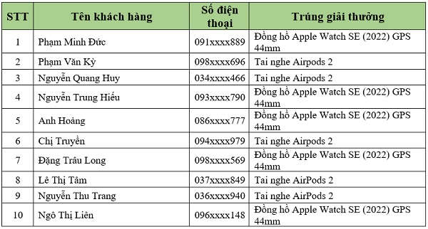 - Ngày 04/06/2024 (Quay thưởng cho các khách hàng mua hàng và được cấp mã dự thưởng từ ngày 23/05/2024 đến ngày 31/05/2024). Số lượng 04 giải, trong đó: 02 giải đồng hồ Apple Watch SE (2022) GPS 44mm; 02 giải tai nghe Airpods 2.