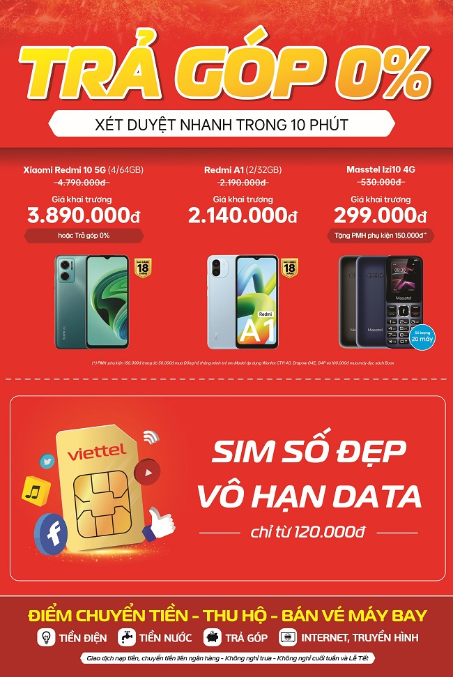- Phạm vi áp dụng: Siêu thị Viettel Store Số 424 Nguyễn Tất Thành, Khối Tân Phong, Phường Quỳnh Thiện, Thị xã Hoàng Mai, Tỉnh Nghệ An.