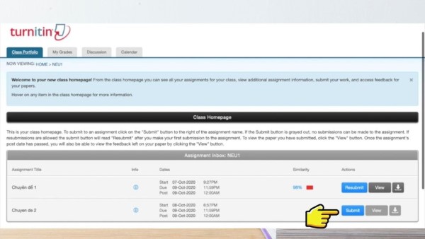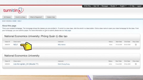 Bước 5: Khi tài khoản đã được kích hoạt, bạn có thể nộp bài và kiểm tra đạo văn bằng cách truy cập vào lớp học mà mình đã đăng ký.