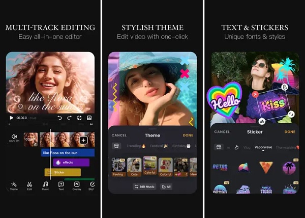 Đây là một trong những ứng dụng được nhiều người sử dụng nhất hiện nay. VivaVideo cung cấp rất nhiều tính năng sửa video cho người dùng như cắt, hợp nhất video, ghép nhạc, thêm dán nhãn, chèn văn bản vào video vô cùng dễ dàng. Ưu điểm nổi bật của ứng dụng này là sở hữu một kho nhạc miễn phí nên bạn không lo bản quyền. Ngoài ra nó còn khá nhiều hiệu ứng chỉnh sửa video rất đẹp, hợp với nhiều chủ đề khác nhau.