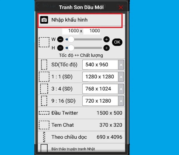 Bước 6: Sau khi vào không gian làm việc, để có thể tùy chỉnh kích thước khổ giấy, bạn click vào Nhập khẩu hình/Import Picture. Tại đây, chúng ta có thể tùy chọn các kích thước có sẵn hoặc tự nhập vào kích thước giấy mong muốn.