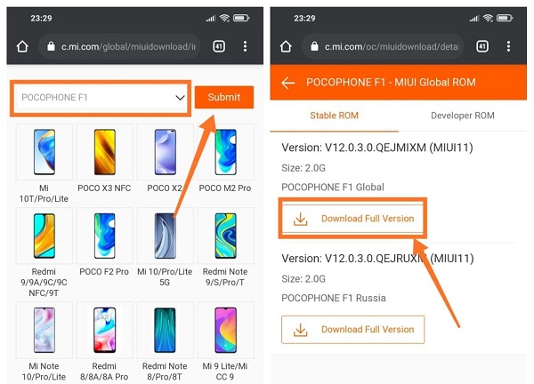 Bước 2: Người dùng hãy nhập tên điện thoại của mình vào ô tìm kiếm. Sau đó người dùng nhấn chọn phiên bản ROM mà bạn muốn cập nhật và sau đó tải về máy.