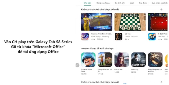 Bước 3: Tải ứng dụng Microsoft 365. Vào CH Play trên Galaxy Tab S11 Series, gõ từ khóa “Microsoft Office” để tải ứng dụng Office.