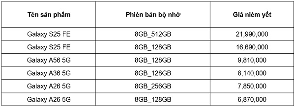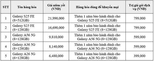 Chương trình áp dụng cho khách hang mua sản phẩm Galaxy S25 FE, A56 5G, A36 5G, A26 5G trên toàn quốc (kể cả trực tuyến), sản phẩm Galaxy có thời hạn kích hoạt bảo hành điện tử (MCS) trong giai đoạn từ ngày 05.12.2025 đến ngày 15.12.2025.