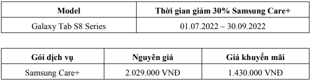 Từ ngày 01/07 đến 30/09/2022, , khi chọn mua Galaxy Tab S8 Series tại Viettel Store, bạn sẽ được giảm ngay 30% gói bảo hành mở rộng Samsung Care+.