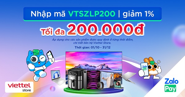 – Nhập mã VTSZLP200, giảm 1% tối đa 200.000đ/giao dịch thanh toán qua ZaloPay. Áp dụng cho sản phẩm được quy định từng thời điểm