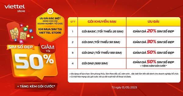 Từ ngày 15/05/2023, Viettel Store triển khai chương trình ưu đãi đặc biệt giảm tới 50%, tặng kèm gói cước dành cho các Doanh nghiệp và Tổ chức khi mua SIM tại Viettel Store.