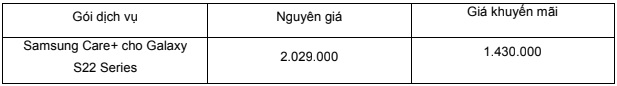 – Trong vòng ba mươi (30) ngày tính từ ngày kích hoạt thiết bị Samsung Galaxy S22 Series và trong thời gian khuyến mãi, khách hàng mang thiết bị Samsung Galaxy S22 Series đến các cửa hàng trải nghiệm Samsung hoặc các đại lý ủy quyền để được nhân viên hỗ trợ đăng ký gói Samsung Care+ với giá khuyến mãi.