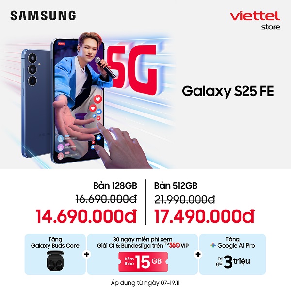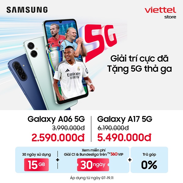 Chủ sở hữu Samsung Galaxy S25 FE, A17 5G và A06 5G sẽ được tặng gói “SS5G” ưu đãi từ Viettel, mang đến tốc độ 5G siêu nhanh và ổn định để thoải mái xem bóng đá, lướt web, chơi game hay giải trí không giới hạn. Xem chi tiết ngay chương trình mới nhất này của Viettel Store!