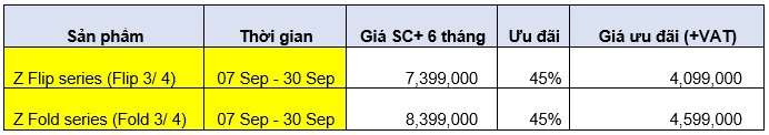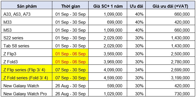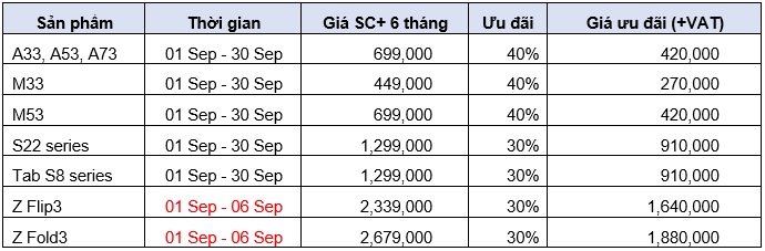 Ưu đãi lên đến 40% đối với các gói Bảo hành mở rộng Samsung Care+ (gói 6 tháng, gói 1 năm hoặc 2 năm) dành cho khách hàng đăng ký cho thiết bị chính hãng theo danh sách dưới đây.