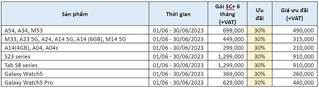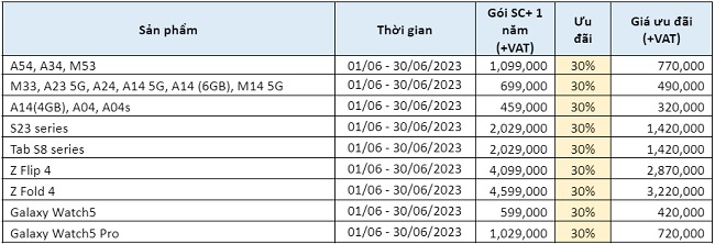 Từ ngày 1/6 đến hết ngày 30/6/2023, ưu đãi lên đến 30% đối với các gói Bảo hành mở rộng Samsung Care+ (gói 6 tháng và gói 1 năm) dành cho khách hàng đăng ký cho thiết bị chính hãng theo danh sách dưới đây: