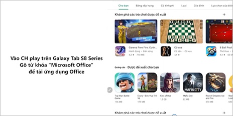– Bước 3: Tải ứng dụng Microsoft 365. Vào CH Play trên Galaxy Tab S9 FE Series, gõ từ khóa “Microsoft Office” để tải ứng dụng Office.