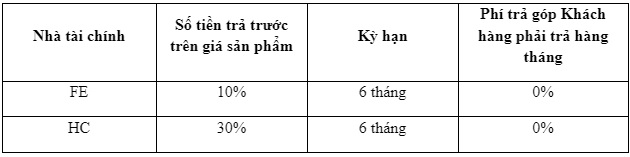 Trả góp lãi suất 0% trong thời hạn lên đến 6 tháng qua Nhà Tài Chính Home Credit và Nhà Tài Chính FE Credit.