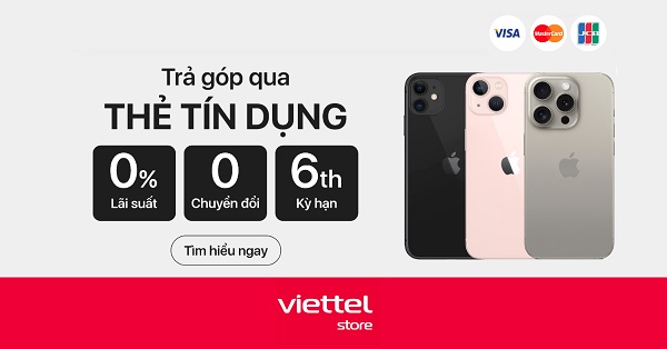 Từ nay đến 31/12/2024, Viettel Store triển khai chương trình ưu đãi trả góp lãi suất từ 0% qua Thẻ tín dụng áp dụng với các sản phẩm Apple.