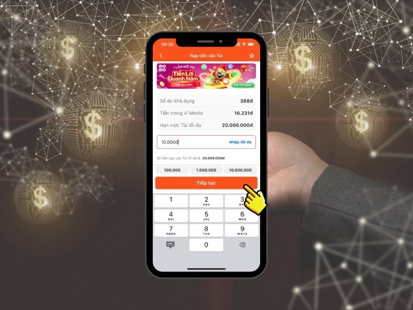 Bước 7: Tại đây, bạn hãy đảm bảo rằng số tiền bạn muốn gửi vào ví thần tài đã có sẵn trong ví điện tử MoMo và hãy tiến hành nhập số tiền muốn gửi dựa trên thông tin hạn mức tối đa tương ứng.