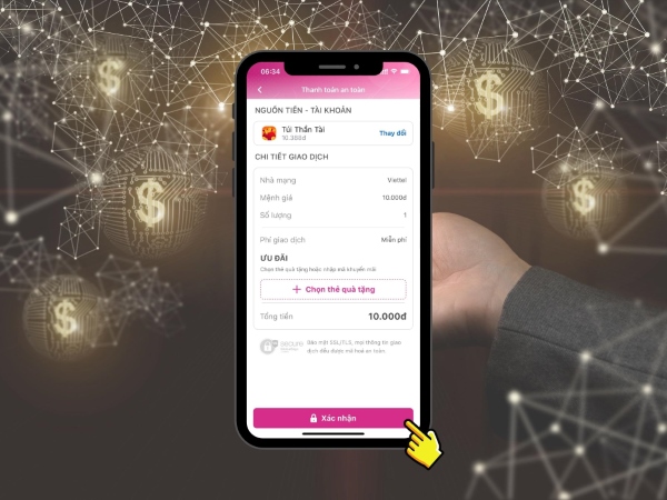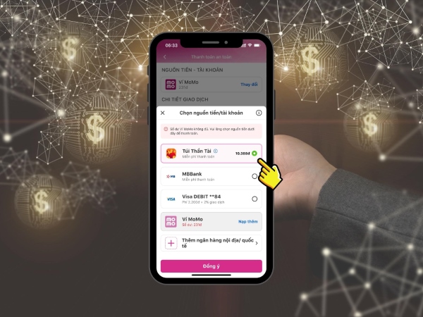 Bước 3: Tại thao tác cho phép lựa chọn Nguồn tiền để thanh toán, bạn hãy ấn chọn Túi Thần Tài > Chọn đồng ý.